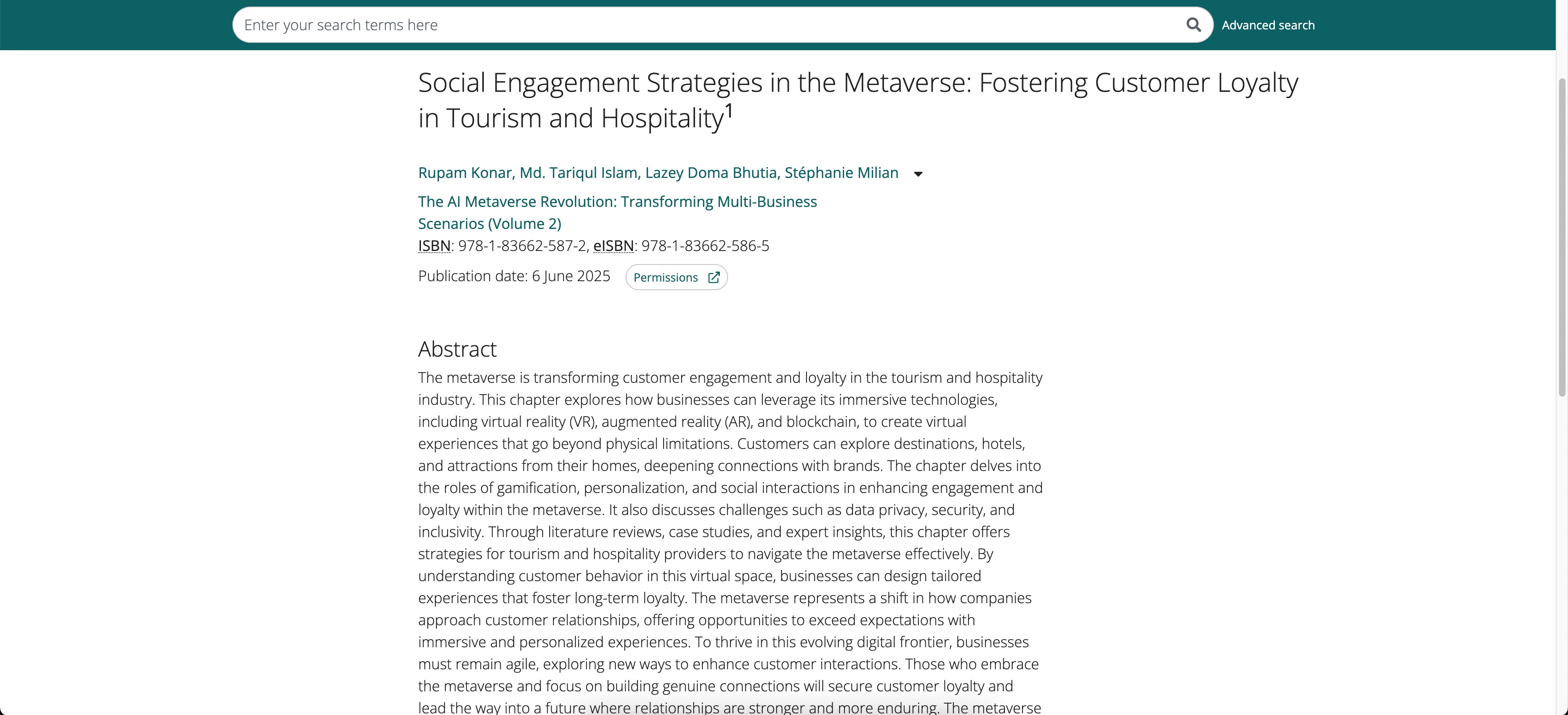 - Konar, R., Islam, M.T., Bhutia, L.D. and Milian, S. (2025), "Social Engagement Strategies in the Metaverse: Fostering Customer Loyalty in Tourism and Hospitality", Kumar, J. and Arora, M. (Ed.) The AI Metaverse Revolution: Transforming Multi-Business Scenarios (Volume 2), Emerald Publishing Limited, Leeds, pp. 119-129. https://doi.org/10.1108/978-1-83662-586-520251009