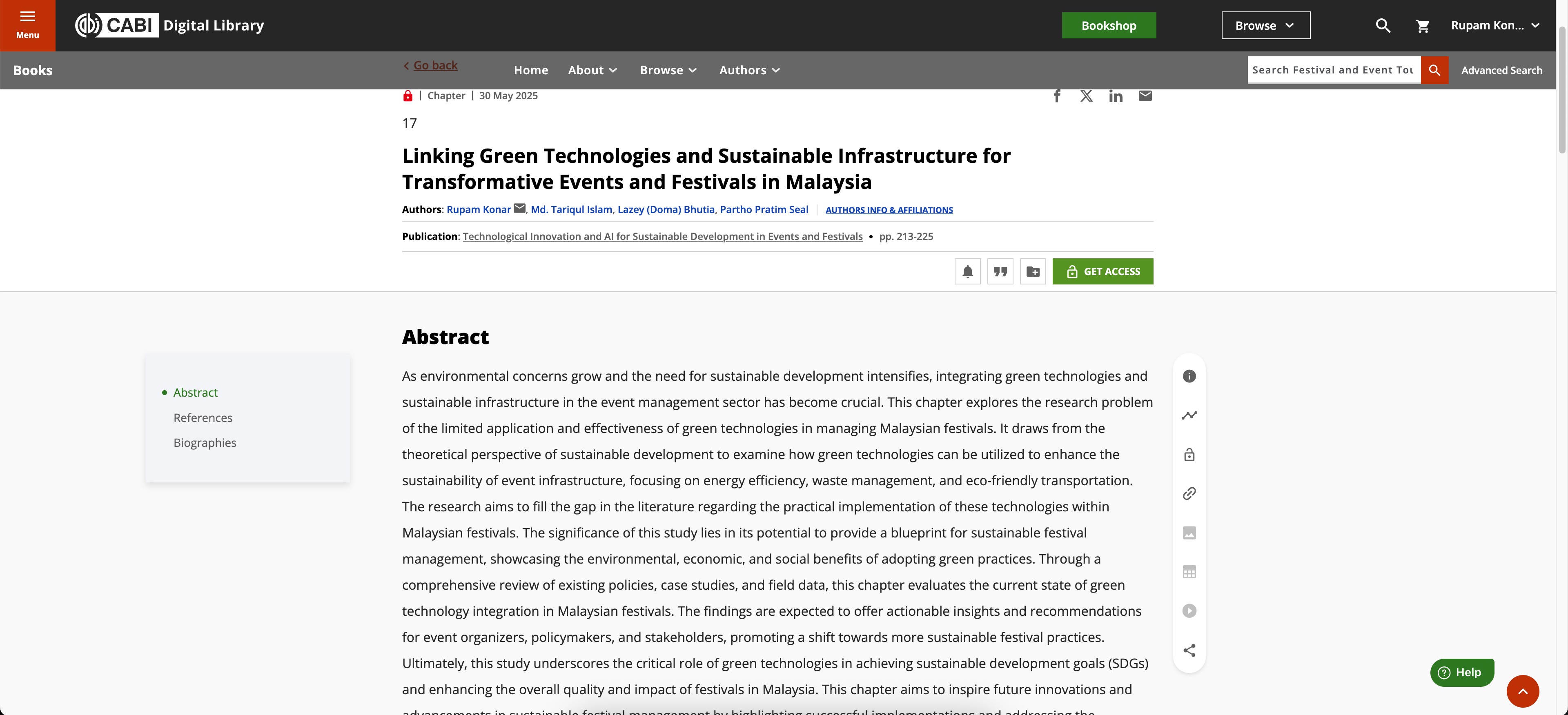 - Konar, R., Islam, M. T., Bhutia, L. (Doma), & Seal, P. P. (2025). Linking green technologies and sustainable infrastructure for transformative events and festivals in Malaysia. In Festival and Event Tourism and Hospitality Series (pp. 213–225). CABI. https://doi.org/10.1079/9781836990185.0017