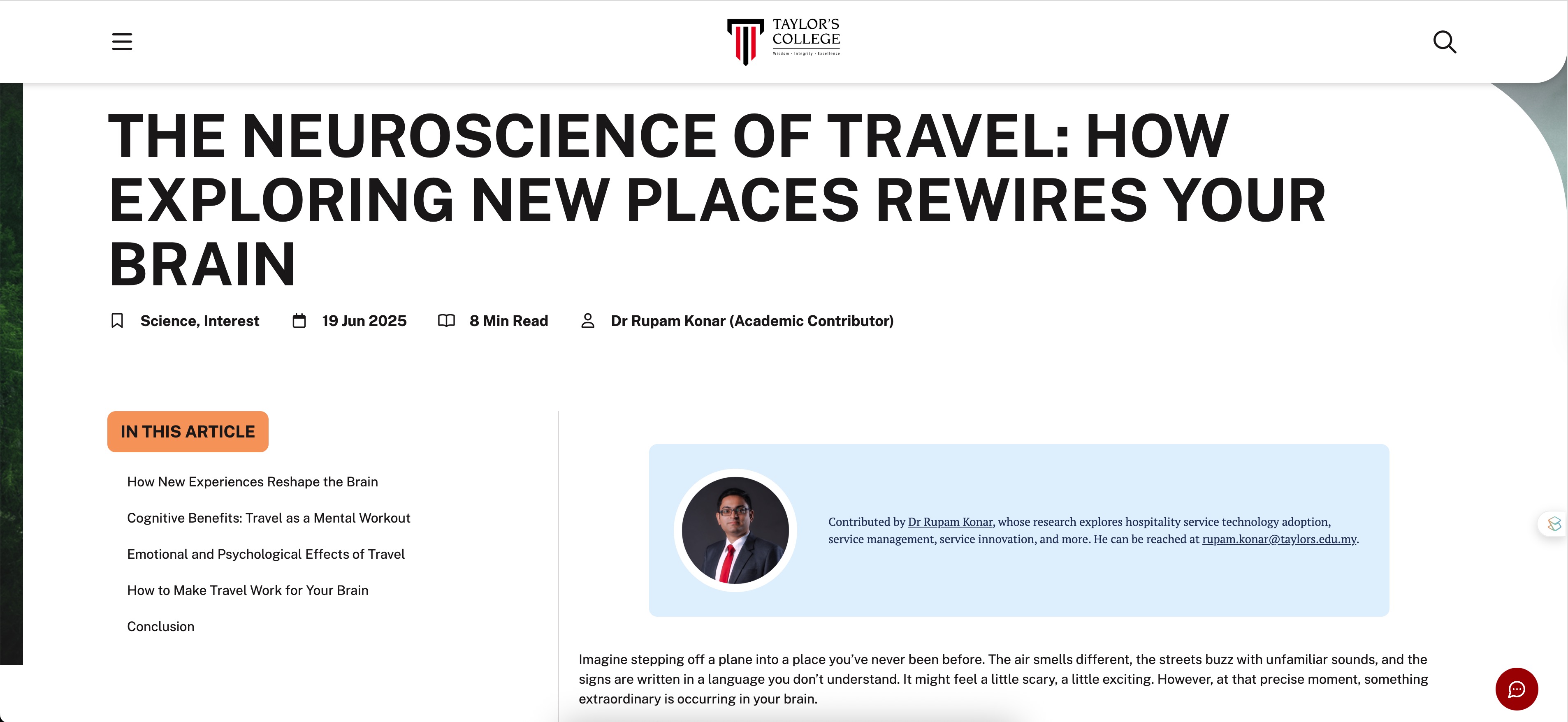 - Konar, R. (2025). The Neuroscience of Travel: How Exploring New Places Rewires Your Brain. https://college.taylors.edu.my/en/student-life/news/2025/the-neuroscience-of-travel-how-exploring-new-places-rewires-your-brain.html?utm_source=linkedin&utm_medium=org_social&utm_campaign=2025_-_tc_article_organicsocial&utm_term=post&utm_content=article_carbon_neutral_the_neuroscience_of_travel#how-to-make-travel-work-for-your-brain